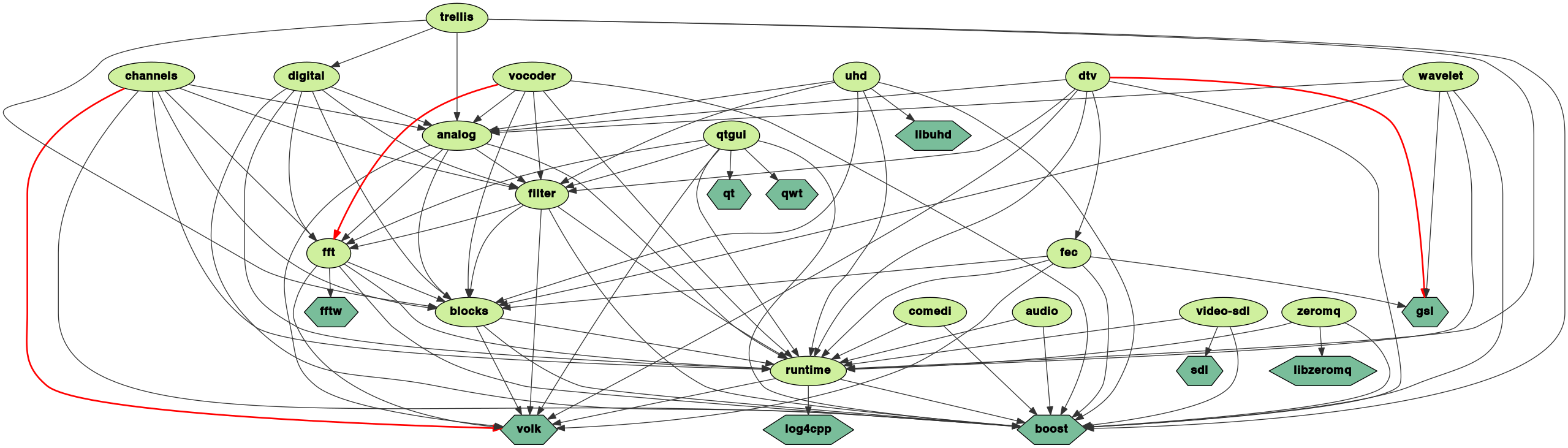 I made a dependency graph of the GNU Radio modules and libraries. The red arrows show indirect dependencies that, currently, have to be added manually to CMake. (I didn’t draw all the red arrows to log4cpp.)